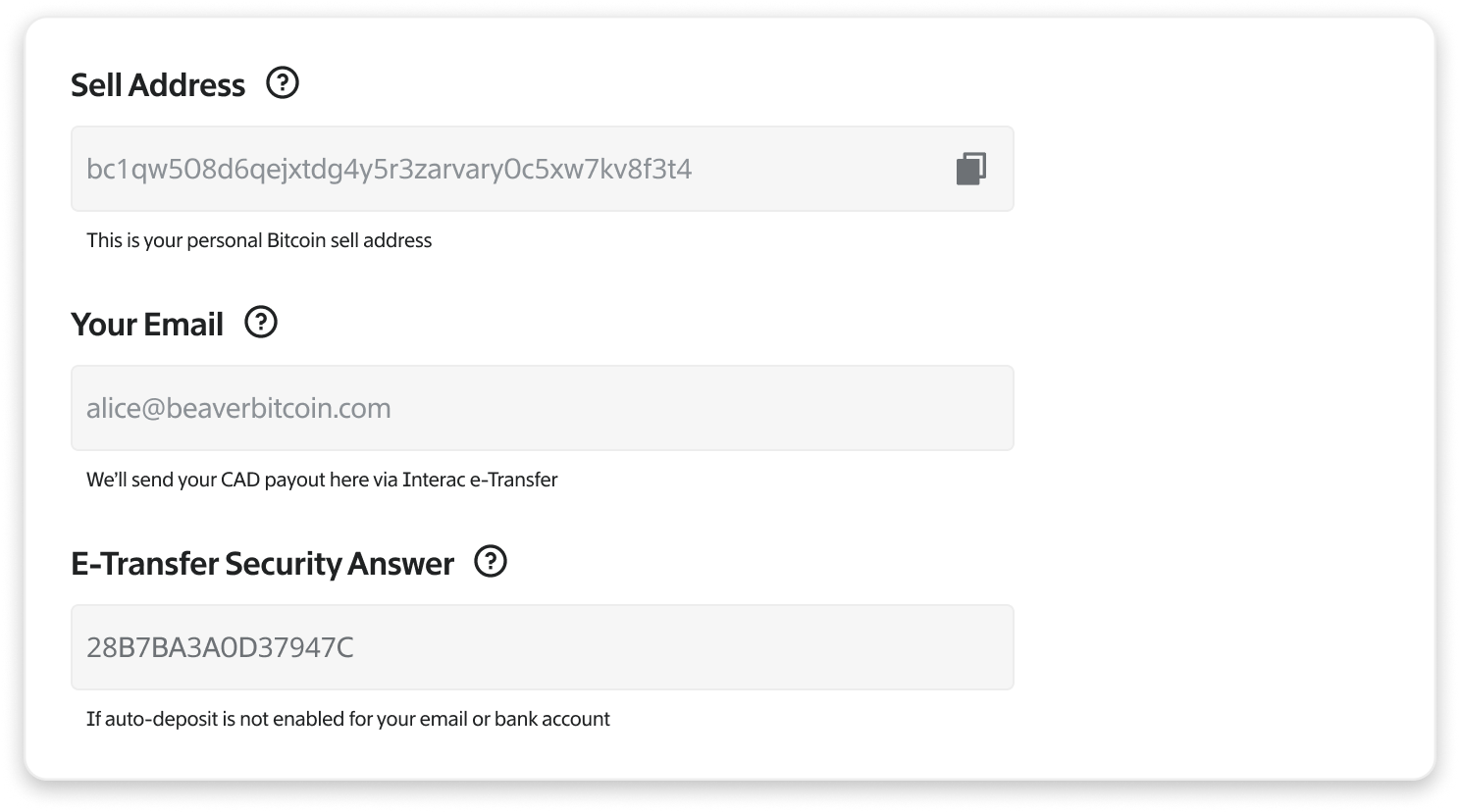 - Any bitcoin you send to your Sell Address is exchanged to CAD and sent to you via Interac e-Transfer.
